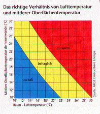 Der Beton in den Decken, sowie die massive Ziegel-Bauweise sorgen für ein ausgeglichenes Raumklima in unseren Häusern! Das Behaglichkeits-Diagramm zeigt: Je wärmer die Bauteil-Oberflächen sind, desto kühler kann die Lufttemperatur sein. Das bedeutet angenehmeres Raumklima und noch geringere „Heizkosten“.