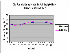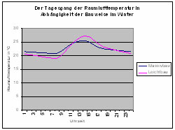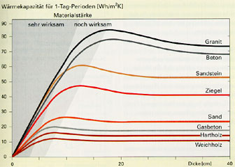 Die Grafiken verdeutlichen die Wirkungsweise: Ersetzt man den Beton im Haus durch etwa Holz, verschieben sich die Kurven nach oben und unten, werden also steiler, das bedeutet die Temperaturen sind nicht mehr ausgeglichen, sondern schwanken stärker. Die Folge wäre zu schnelle Überhitzung bei Sonne – man müsste schnell Verschatten und schnellere Auskühlung am Abend.